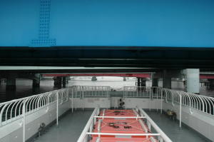 有明からは11:55発の「潮音」(56t)に乗ることが出来ました。桟橋に着けていたので、間に合わないかなーと思ったのですが無事に 乗ることが出来ました。ほんの少し前に「いりす」が出て行ったからかお客はぼくだけでした。遊歩甲板で過ごしたのですが、橋の下を 通るときは迫力がありますねー。頭のてっぺんから桁下まで1mもないんですから。気付かずに頭ぶつけちゃったよー、なんて人いるの かな?ちょっと気になります(笑)