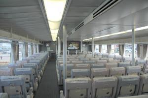 一番前の2列は向かい合わせになっています。これは運航する会社によって異なっているようで、トッピーや佐渡汽船では普通の座席になっているようです が、香港〜マカオのターボジェット社の1階は同じように向かい合わせでした。グループには良いかもしれませんが、他人同士で向かい合いって言うのは ねぇ、あれでしょ。・・・電車に乗ってるって思えば気にならないかな?(笑)